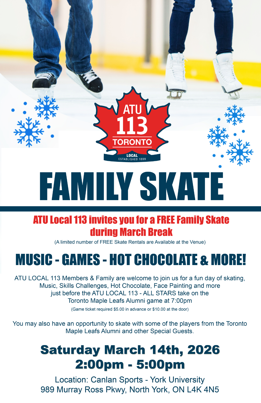 The Family Skate takes place just before the ATU Local 113 All-Stars face the Toronto Maple Leafs Alumni at 7:00 PM.