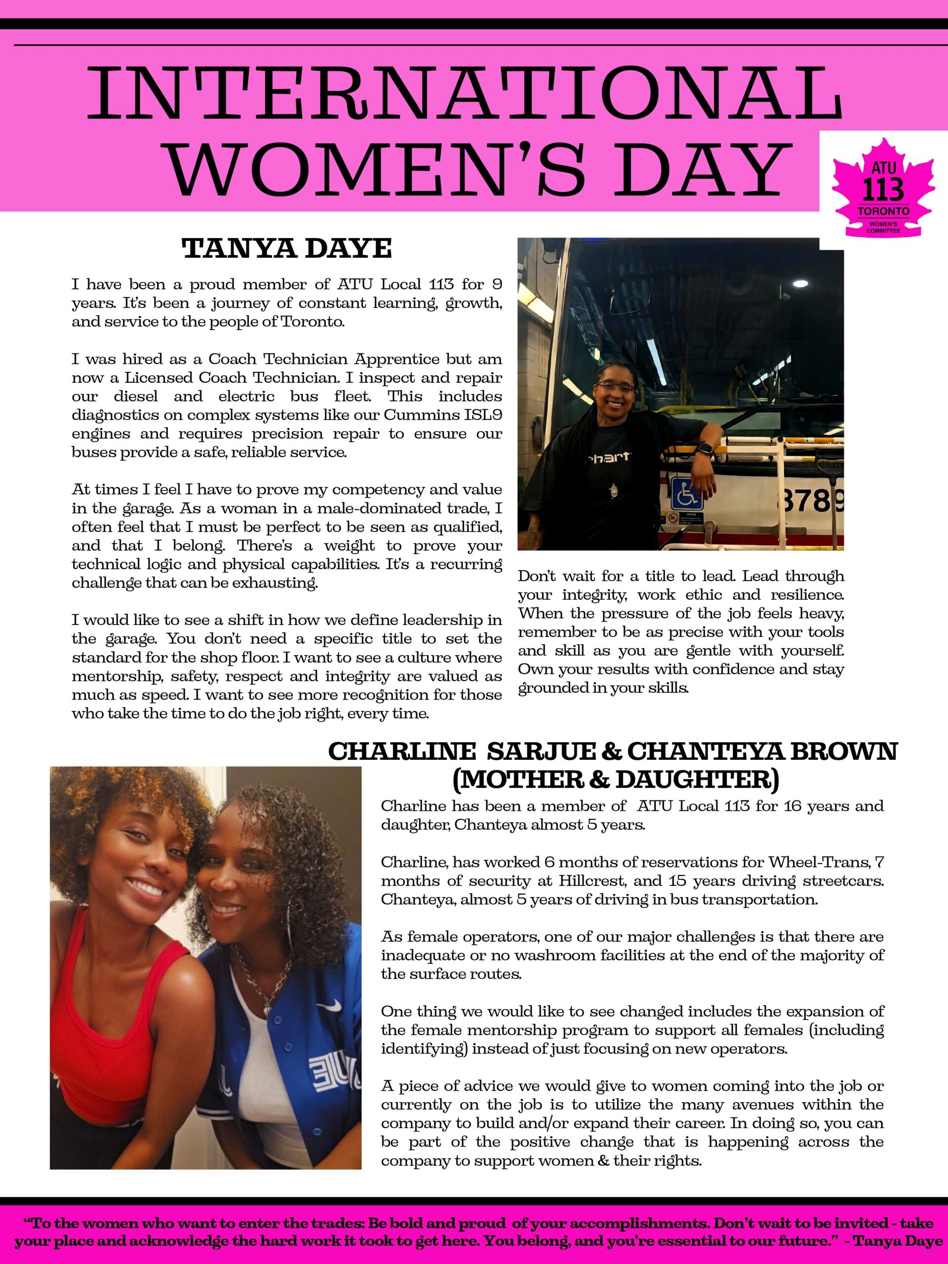 We’re also proud to highlight Charline Sarjue and Chanteya Brown, a mother-daughter team serving Toronto riders. Charline has been a member of ATU Local 113 for 16 years and spent most of her career driving streetcars after roles in Wheel-Trans reservations and security at Hillcrest. Chanteya, a bus operator of nearly 5 years, followed in her mother’s footsteps to build her own path in transit. Together, they highlight the importance of utilizing company resources for growth and the importance of improving working conditions, including adequate washroom facilities at route endpoints.